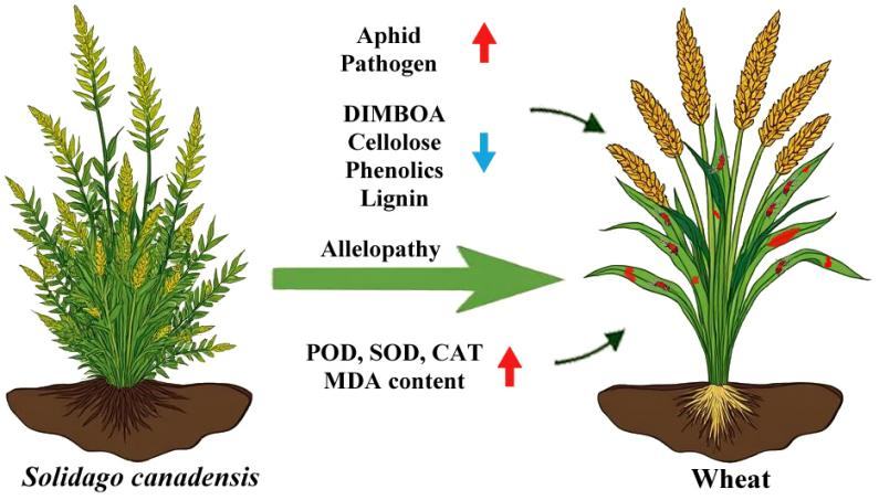 图1 加拿大一枝黄花通过化感物质影响小麦生理与抗性的机制概念图