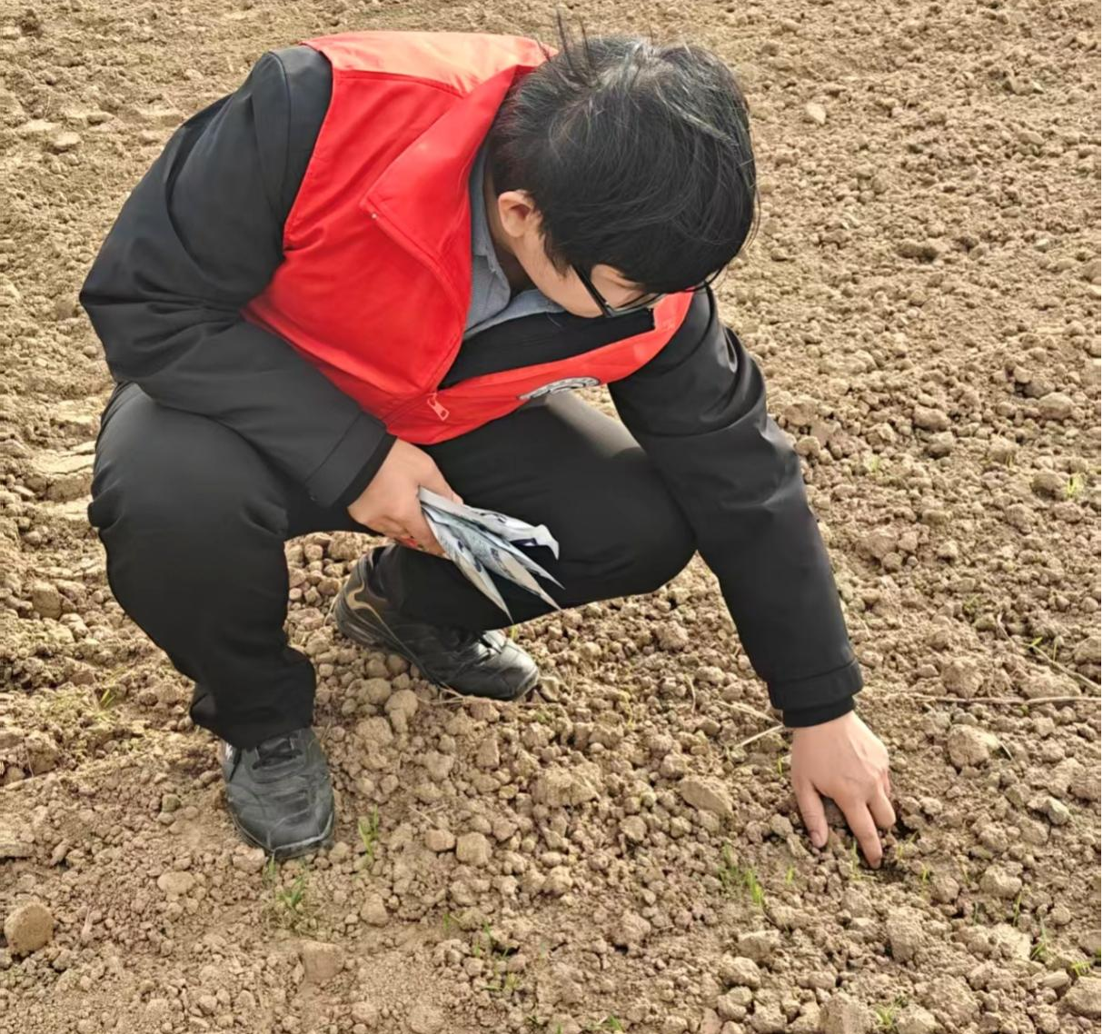 在良西庄村的麦田里,朱玉涛博士仔细察看小麦出苗情况,针对苗情长势、土壤墒情及当前气候特点,为农户提供了具体的技术建议。他围绕小麦冬季水肥管理、病虫害预防、抗寒保苗等关键环节,用通俗易懂的语言向村民讲解了科学管理方法,解答了种植过程中遇到的实际问题。