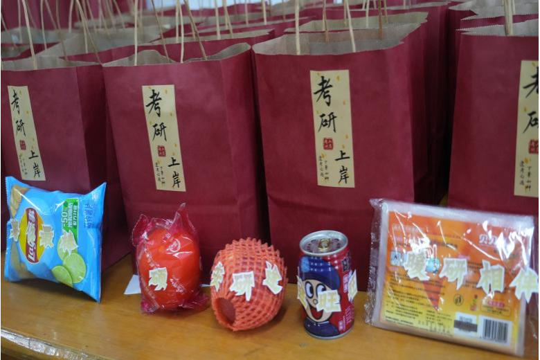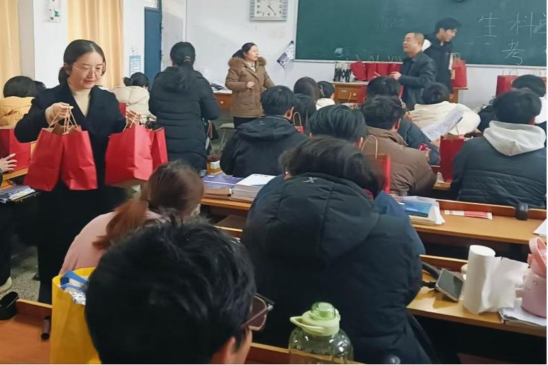 活动伊始,武二伟与考研员工亲切交谈,并发表暖心讲话,他鼓励大家在最后冲刺阶段保持良好心态,合理安排复习时间,坚定信心、勇往直前,以最佳状态迎接考试。随后,武二伟、王莲哲为考研学子发放学院精心准备的慰问礼包,以"五重祝福"传递关怀:薯片表示"薯你最棒"、印有卡通图案的旺仔寓意"研途旺旺"、红彤彤的苹果寓意"苹安研途"、暖宝宝贴代表"暖研相伴"、金灿灿的橙子象征"橙功上岸"。这份承载着五重期许的礼包,既是物质补给,更是精神铠甲,让学子们在凛冬中感受到学院如春的守护。